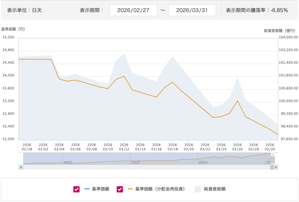 3月末の基準価額は32,176円。月を通じて右肩下がりの展開となりました。下落幅はS&P500よりやや大きく、米国以外の市場も連れ安となった形です。