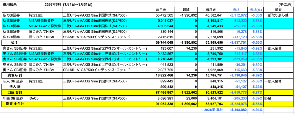 2026年3月の1か月間では損益率-5.86%、金額にして-5,224,973円の評価損となりました。