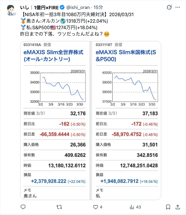 【NISA年初一括3年目1080万円 夫婦対決】2026/03/31